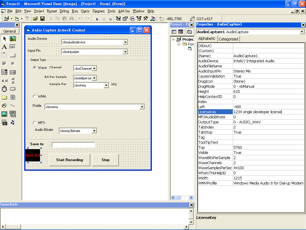 Introduction Where to put the License Key info to activate the full version Audio Capture ActiveX Control Where to put the License Key info to activate the full version After you paid the order, you will receive the license key. You can set the key in LicenseKey property in design time and save the project.