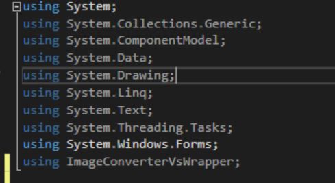 4. select Select Form1.cs, press F7, add the following import statements to the top of the page.