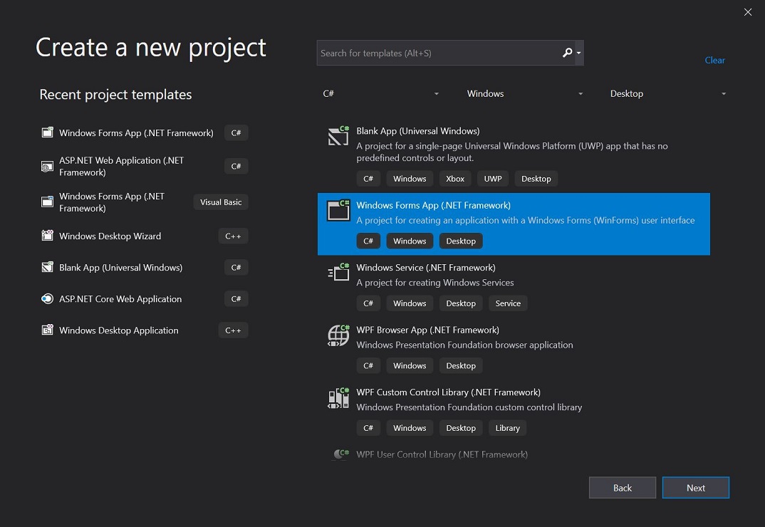 1. Assuming that you have already run the ASP.NET Image Converter SDK Component installation program and started visual studio 2019, the next step is create a new project, select Windows Forms App (.NET Framework). Click OK.