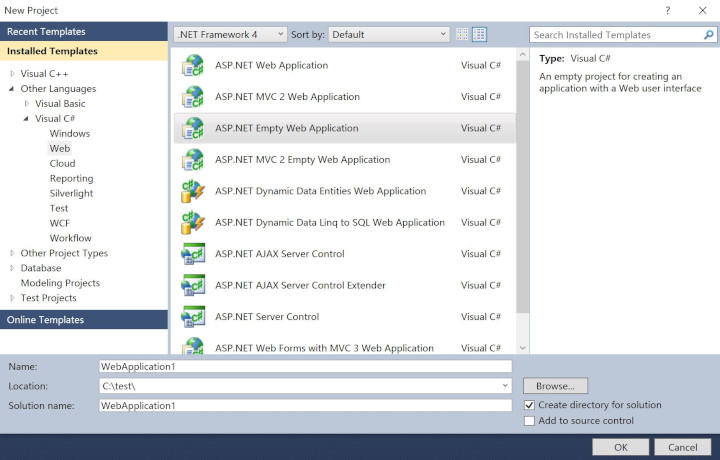 1. Assuming that you have already run the ASP.NET PDF Processing SDK Component installation program and started visual studio 2010, the next step is create a new project, select ASP.NET Empty Web Application. Click OK.