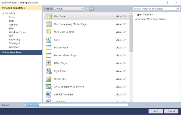 3. Select WebApplication1 in Solution Explorer, right click the mouse, select Add - New Items... , select Web Form, enter the Default.aspx name.