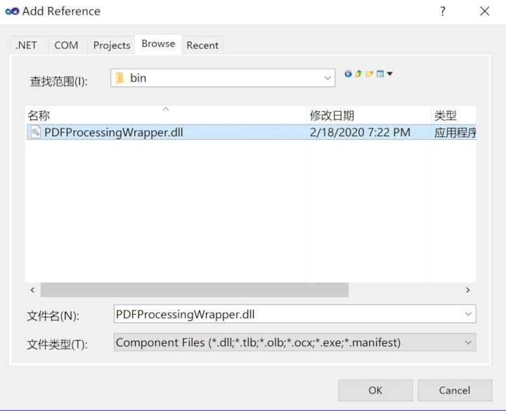 2. In Solution Explorer, selected References, right click the mouse, select Add Reference... , select Browse, select PDFProcessingWrapper.dll from