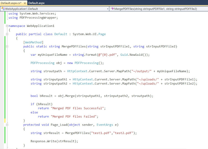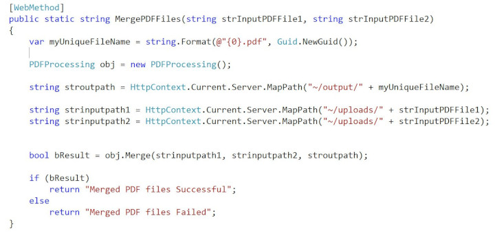 6. Add MergePDFFiles function and Create an instance of ASP.NET PDF Processing SDK Component and then call Merge method.
