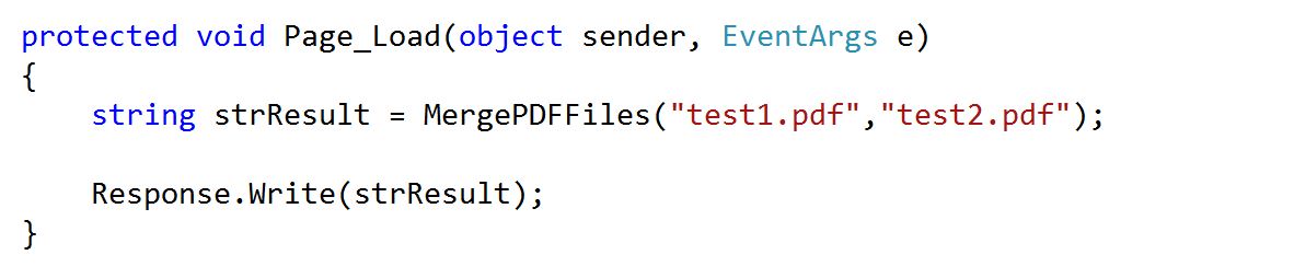 string strResult = MergePDFFiles("test1.pdf","test2.pdf");