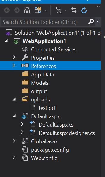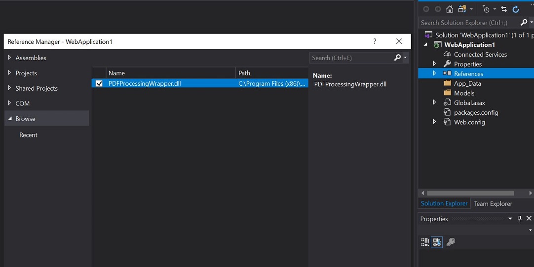 3. In Solution Explorer, selected References, right click the mouse, select Add Reference... , select Browse, select PDFProcessingWrapper.dll from