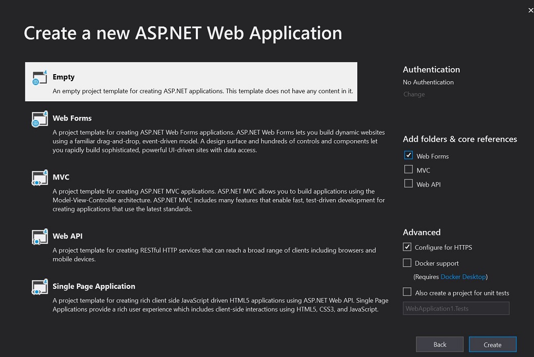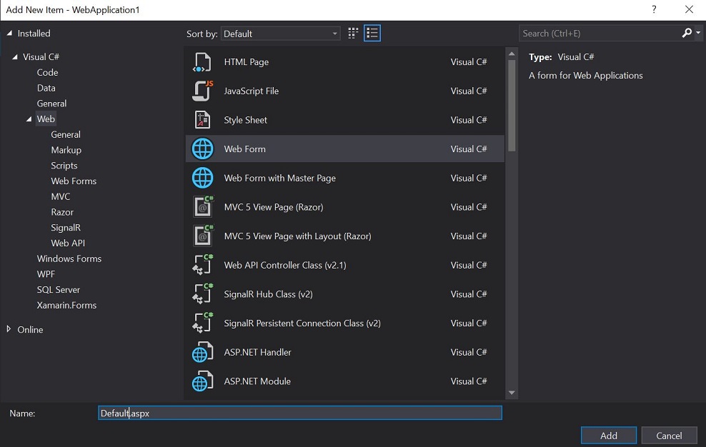 4. Select WebApplication1 in Solution Explorer, right click the mouse, select Add - New Items... , select Web Form, enter the Default.aspx name.