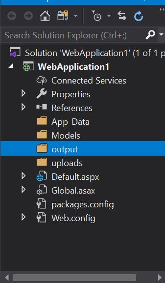 5. Select WebApplication1 in Solution Explorer, right click the mouse, select Add - New Folder, rename the folder to output and Add - New Folder again.