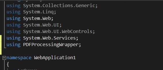 7. Open Default.aspx.cs, add the following import statements to the top of the page.