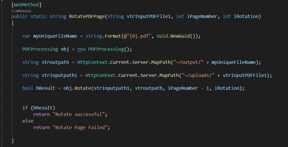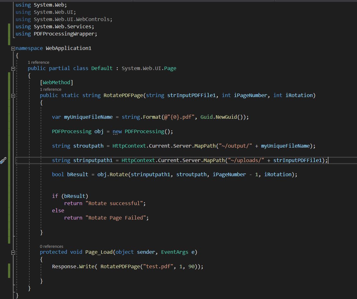 8. Add RotatePDFPage function and Create an instance of ASP.NET PDF Processing SDK Component and then call Rotate method.