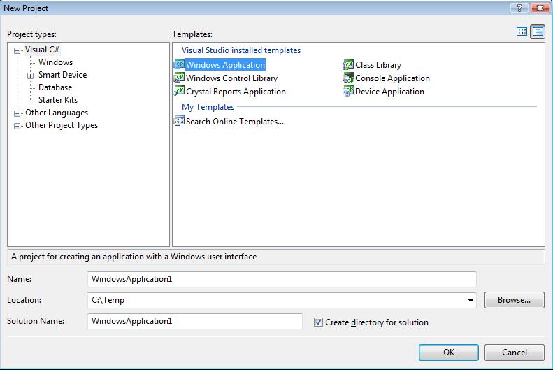 Assuming that you have already run the VideoEdit Gold ActiveX Control installation program and started visual studio 2005, the next step is create New Project, select Windows Application.