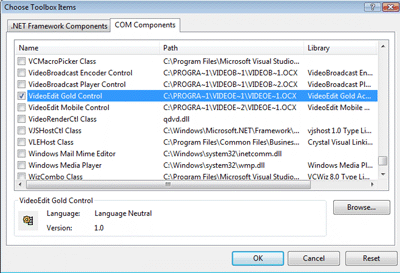 In Toolbox, Right Click mouse and Select Choose Items... , Select VideoEdit Gold Control in COM Components Tab.