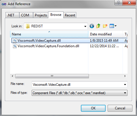 3. Select Browse tab, Navigate to the extracted Video Capture .Net SDK for REDIST folder, open it, and then double-click Viscomsoft.VideoCapture.dll