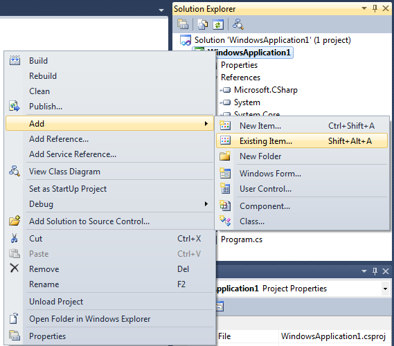 4. In the Solution Explorer, right-click on your project, and then click Add - Existing Item ....