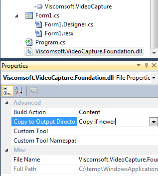 7. Select Viscomsoft.VideoCapture.Foundation.dll , In the Properties window, Change the Copy to Output Directory property to Copy if newer.