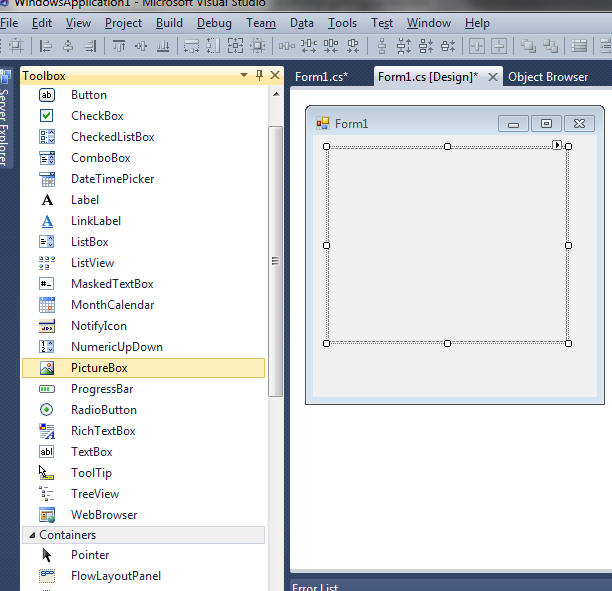 10. double click Form1.cs in the Solution Explorer and Drag the PictureBox to form.