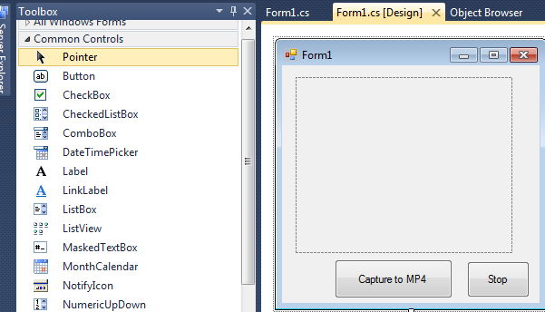 12. double click Form1.cs in the Solution Explorer and Drag the two button to form . For button1, In the Properties window, change the Text to "Capture to MP4"