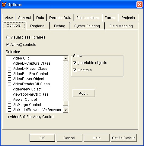 Assuming that you have already run the VideoEdit Gold ActiveX Control installation program and started Visual Foxpro, the next step is to create a project. To do this begin by selecting the "New Project" command from the file menu. Then choose Tools->Options->Controls->ActiveX controls, checked "VideoEdit Gold Control" and press "Set as default" to include the file "VideoEdit Gold ActiveX Control" into the new project.