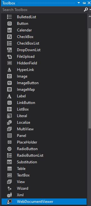 6. In Toolbar, select WebDocumentViewer control icon, drag to default.aspx source code.