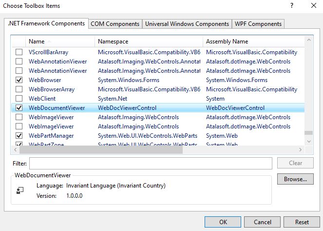 3. In Toolbox, Right click the mouse, select Chooses Items... , In .NET Framework Components, select Browse, select WebDocViewerControl.dll from
