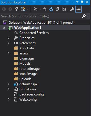 7. Open Windows Explorer, select "assets", "bigimage", "rotatedimage", "smallimage", "uploads" folder, Drag these folde to your WebApplication1 in Solution Explorer.