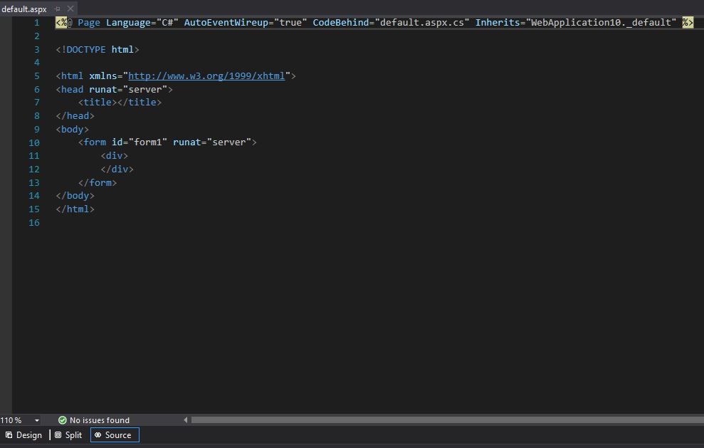 5. Select default.aspx in Solution Explorer, selected source tab for view the html code.