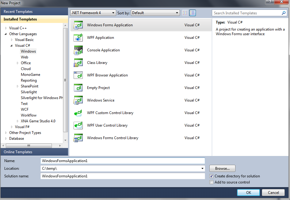 Assuming that you have already run the Movie Maker Timeline Control Control installation program and started visual studio 2010, the next step is create New Project, select Windows Form Application.
