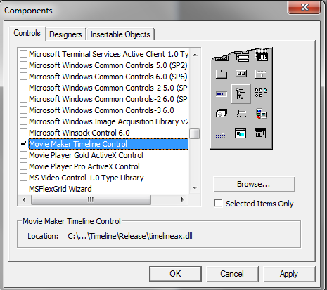 Assuming that you have already run the Movie Maker Timeline Control installation program and started Visual Basic, the next step is to create a project. To do this begin by selecting the "New Project" command from the file menu and select "Standard EXE" as your project type. Then use the "Project/Components.." command to include the file "Movie Maker Timeline Control" into the new project