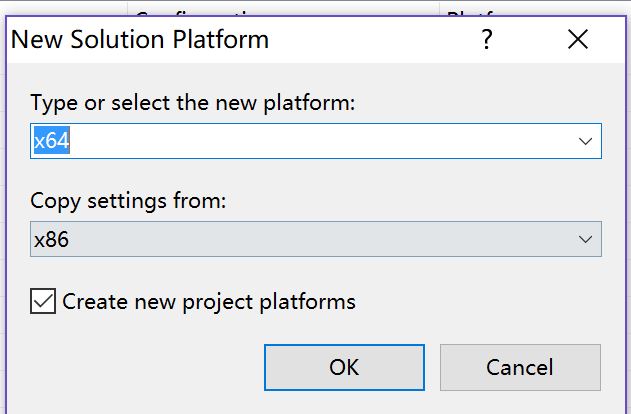 9. Select x64 in "Type or select the new platform:" , then click OK.