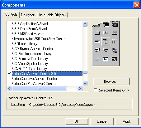 Assuming that you have already run the Videocap ActiveX Control installation program and started Visual Basic, the next step is to create a project. To do this begin by selecting the "New Project" command from the file menu and select "Standard EXE" as your project type. Then use the "Project/Components.." command to include the file "videocap.ocx" into the new project. You will see VideoCap ActiveX Control icon appear at the bottom of the toolbox.