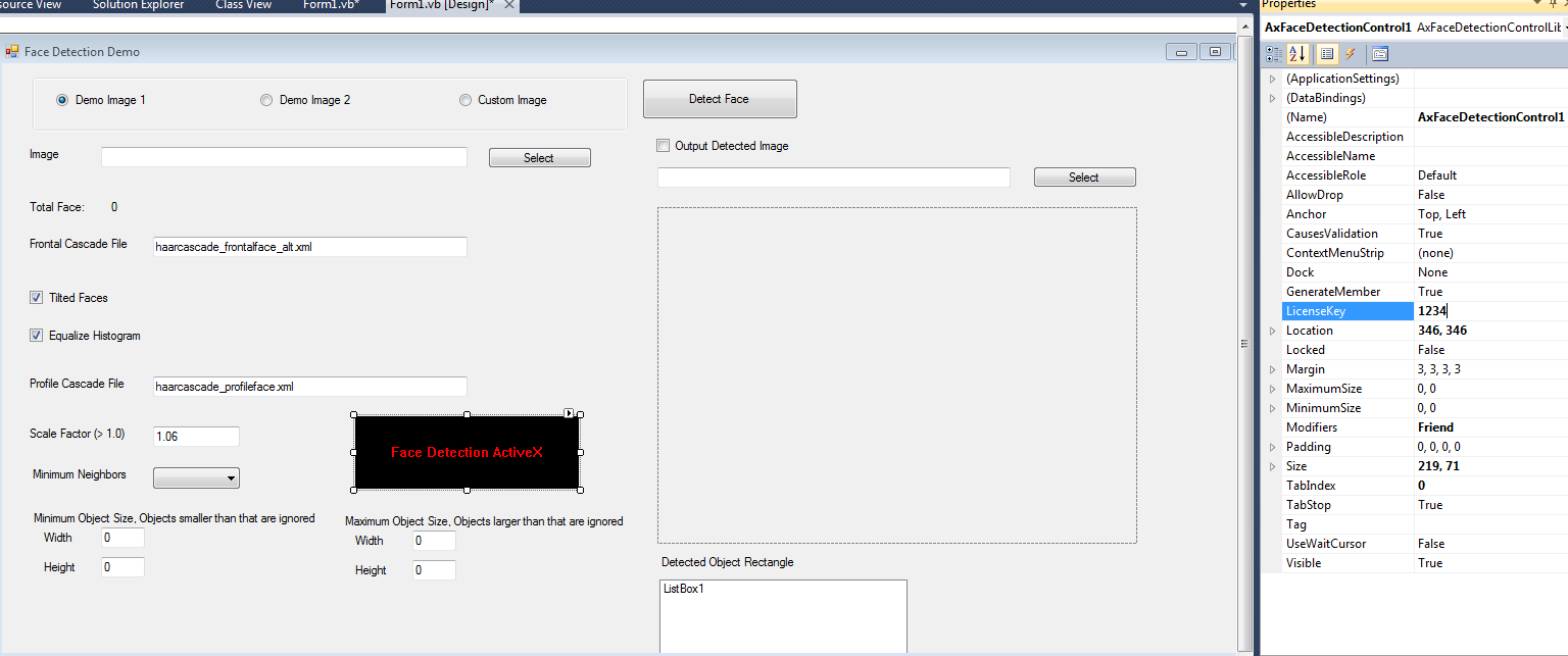 Select the Face Detection ActiveX Control, In properties Window, set LicenseKey property.